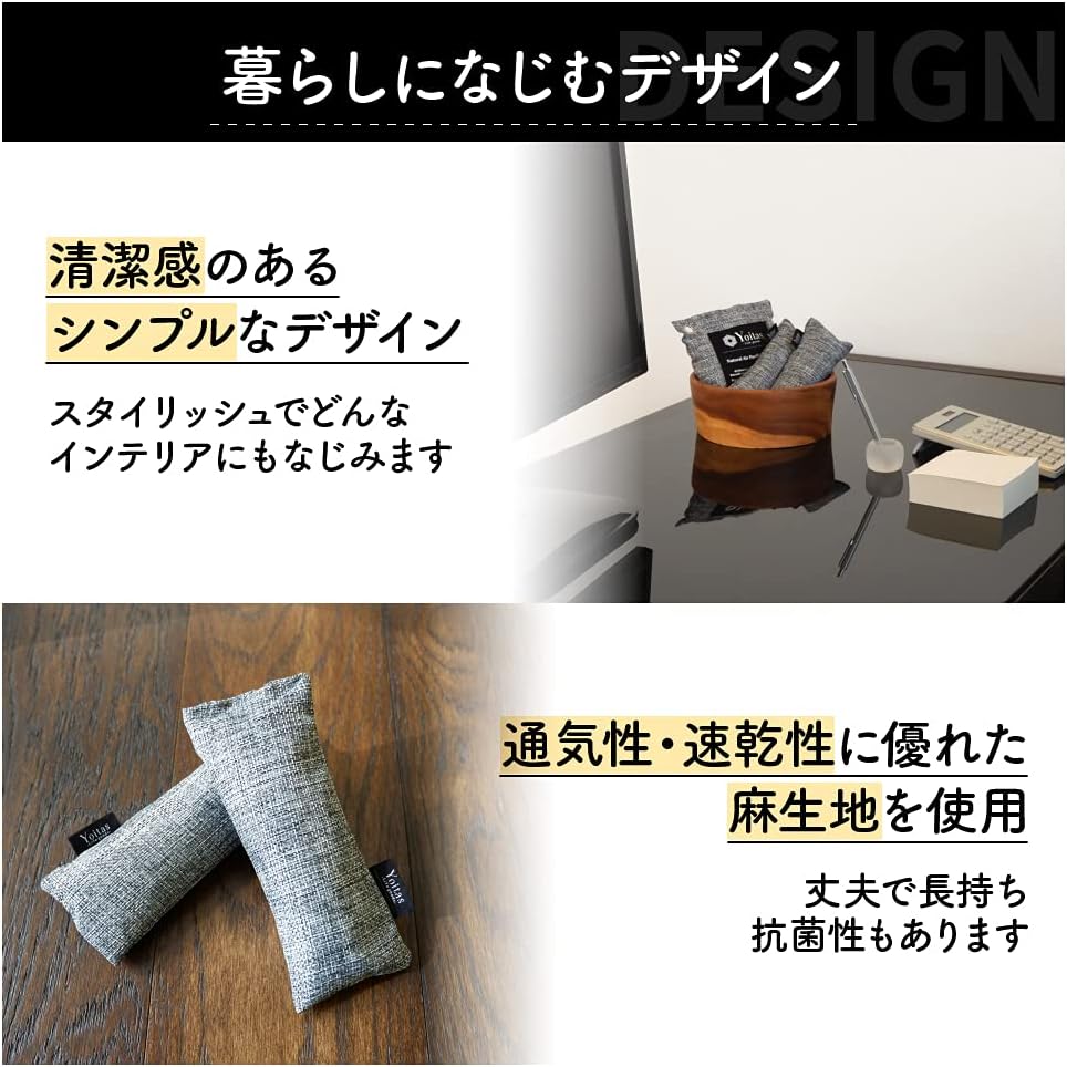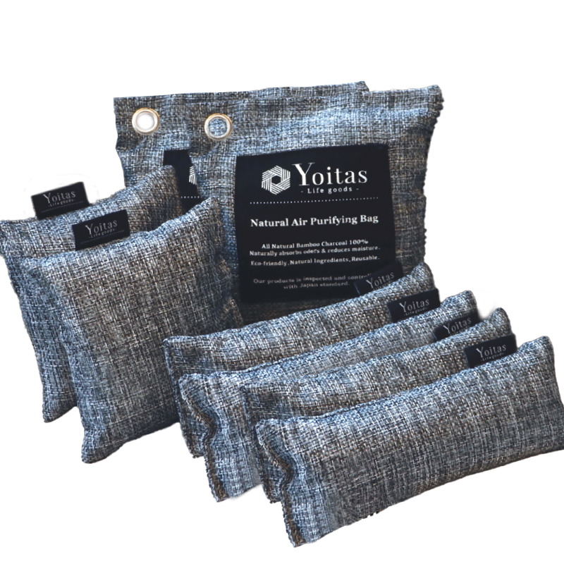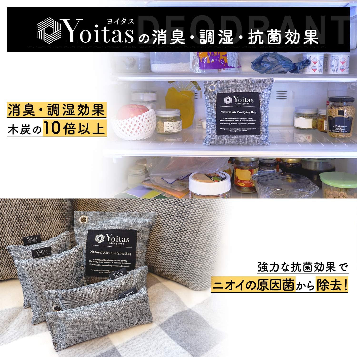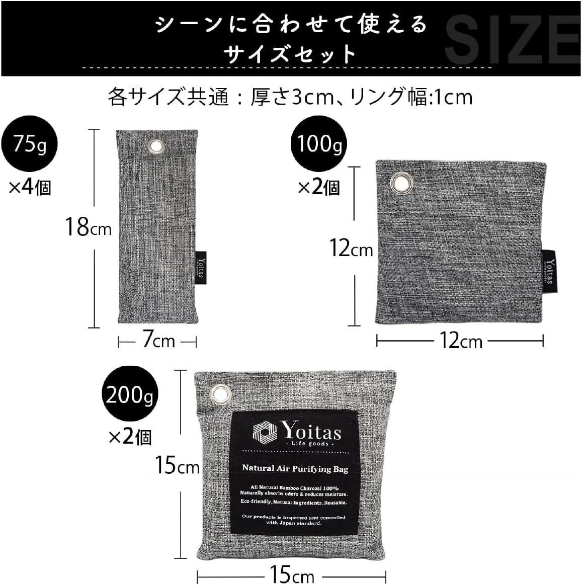 - Yoitas(ヨイタス)竹炭 消臭 除湿 パック 8個セット 内容(200g×2個、100g×2個、75g×4個、取扱説明書) 大人靴~子供靴まで使える75gパックや除湿器などが入らないスペースにも使える100gと200gがセットになったお得なセットです。