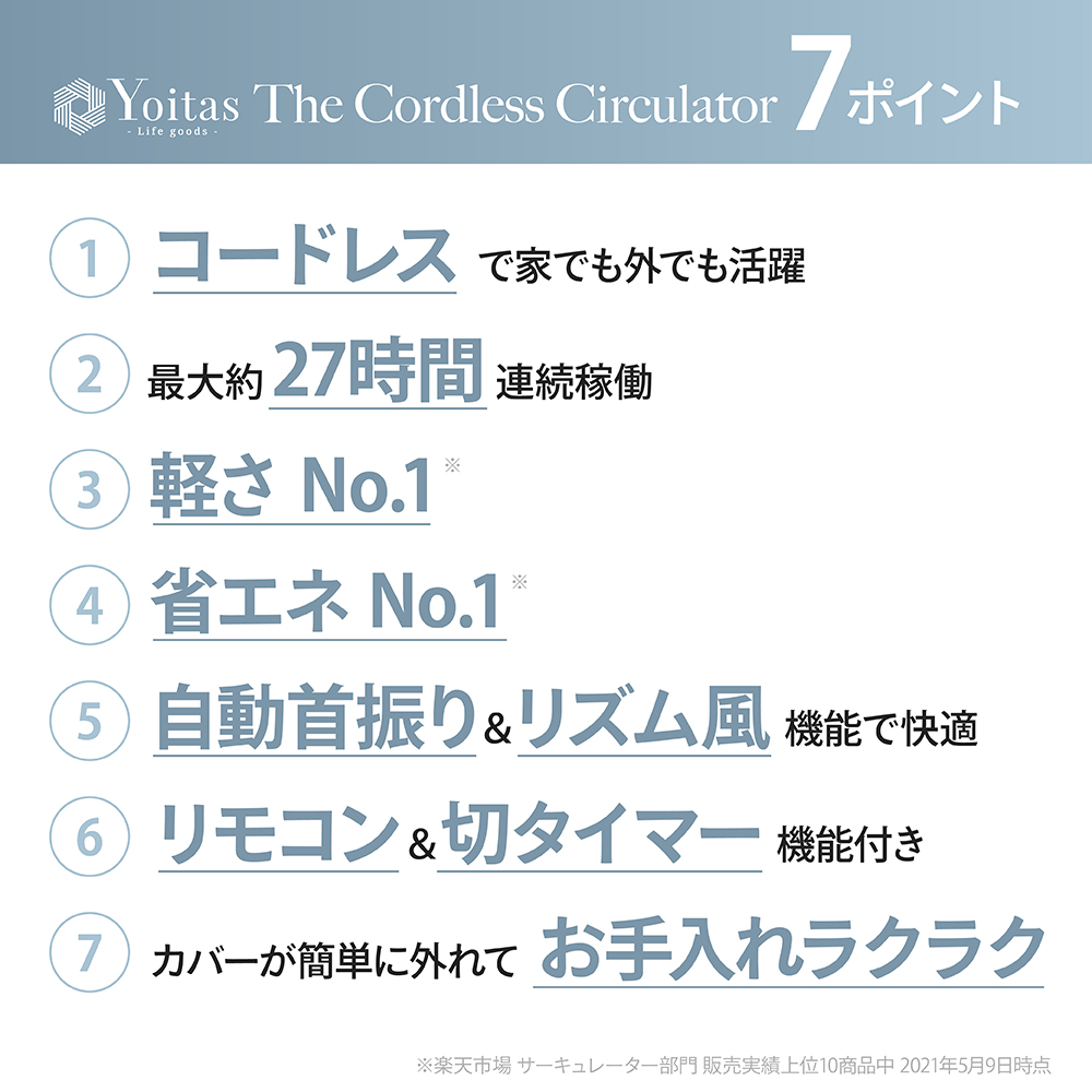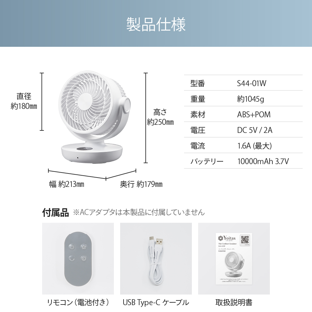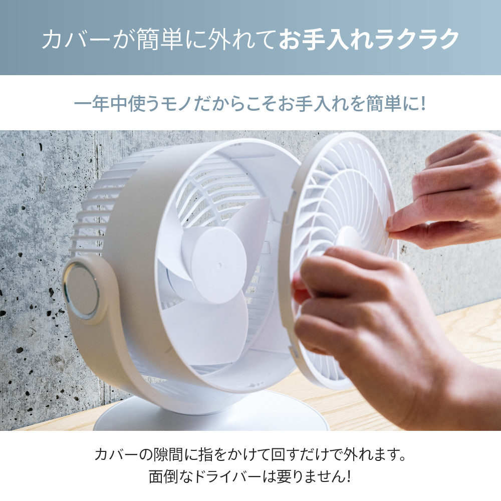 - 【軽量で持ち運びラクラク】様々な場所でお使いただけるように本体重量を約1,045gと軽量化し、持ち運びの負担を最小限に抑え、夏の猛暑でも熱中症対策として野外での利用時にも場所も取らないコンパクト設計のサーキュレーターです。