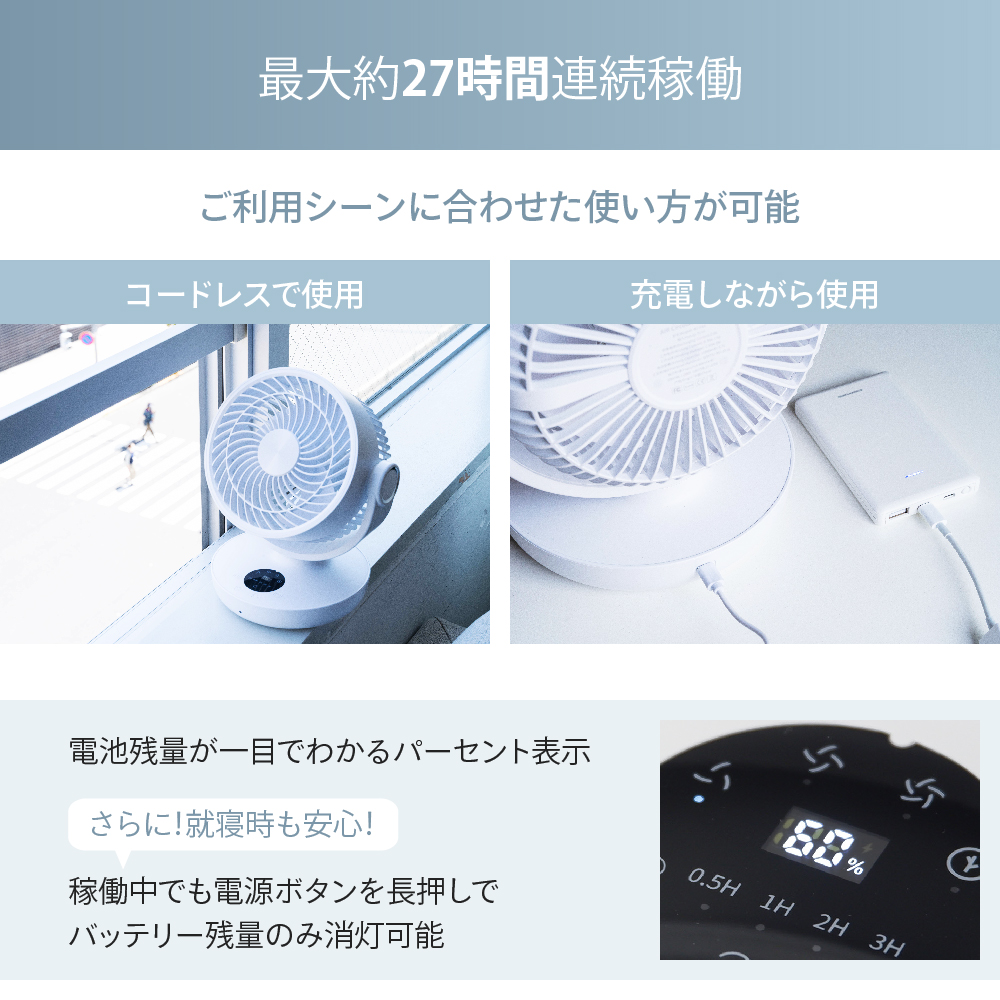 - 【コードレス 最大約27時間連続稼働】10,000mAhのリチウムイオンバッテリーを搭載しており、残量バッテリー表示モニター付き。最大約27時間の連続稼働が出来るコードレスタイプです。室内に限らず、キャンプや車中泊などアウトドアの際にもお使いいただけます。