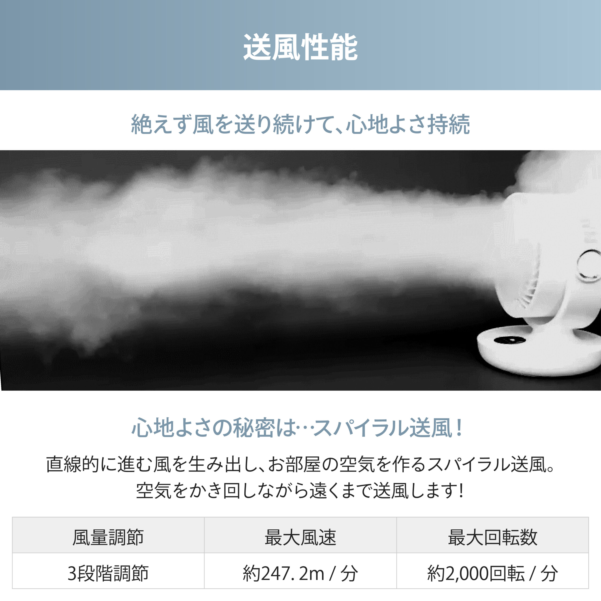 - 【強風・強力 最大風速約2,472.2m/分】スパイラル送風は直線的に進む風を生み出し、 お部屋の空気をかき回しながらより遠くまで風を届けることが可能です。コードレスながらサーキュレーターの性能を落とさずにパワフルな風を送ることができます。