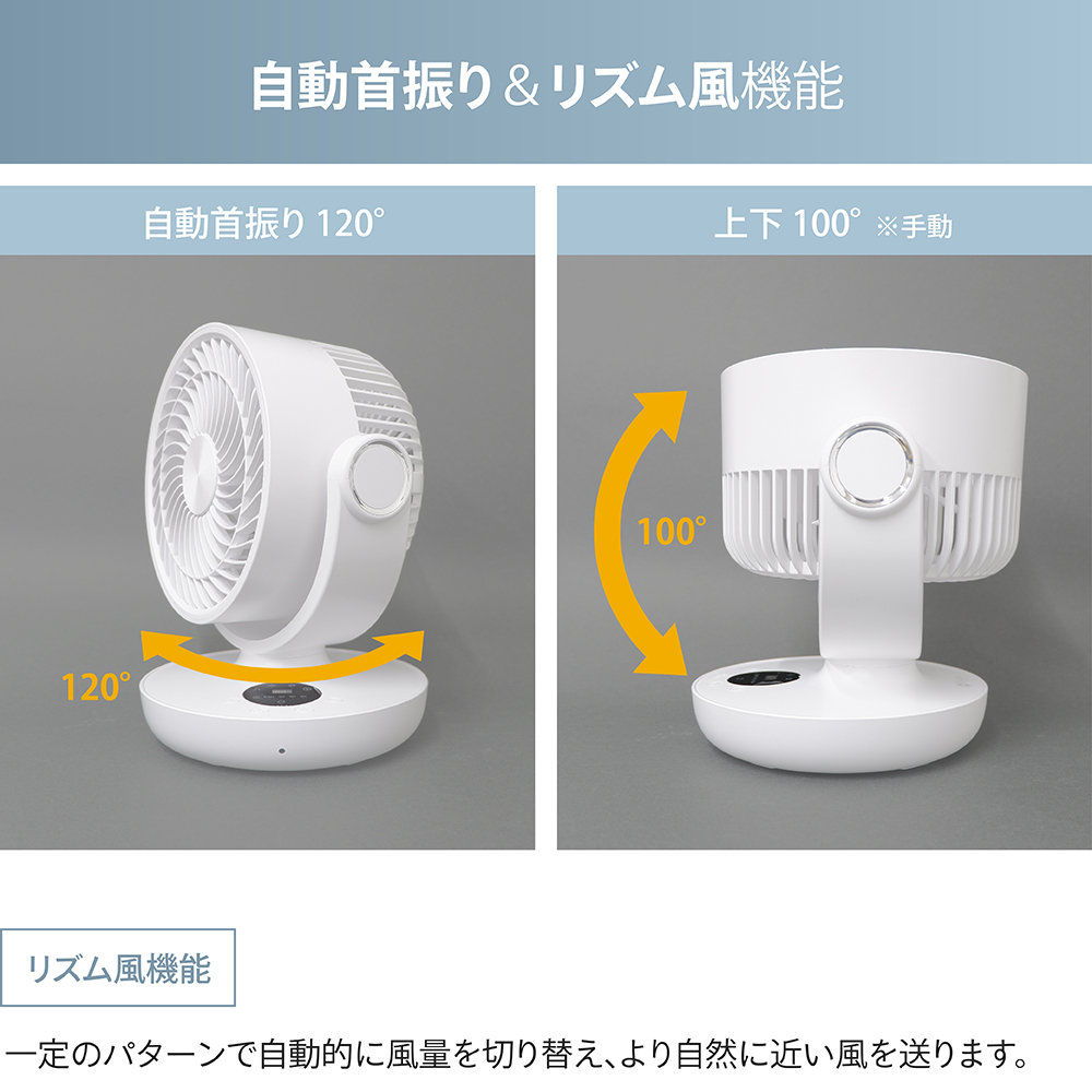 - 【自動首振り・リモコン】自動首振りは左右120°、上下は手動で100°(真上)まで動き、従来の自動首振りでは出来なかった、手動での角度調節が可能です。本体と同じボタンのリモコンが同梱されてますので、キッチンからリビングまでの遠距離でも風量調整が簡単に操作できます。