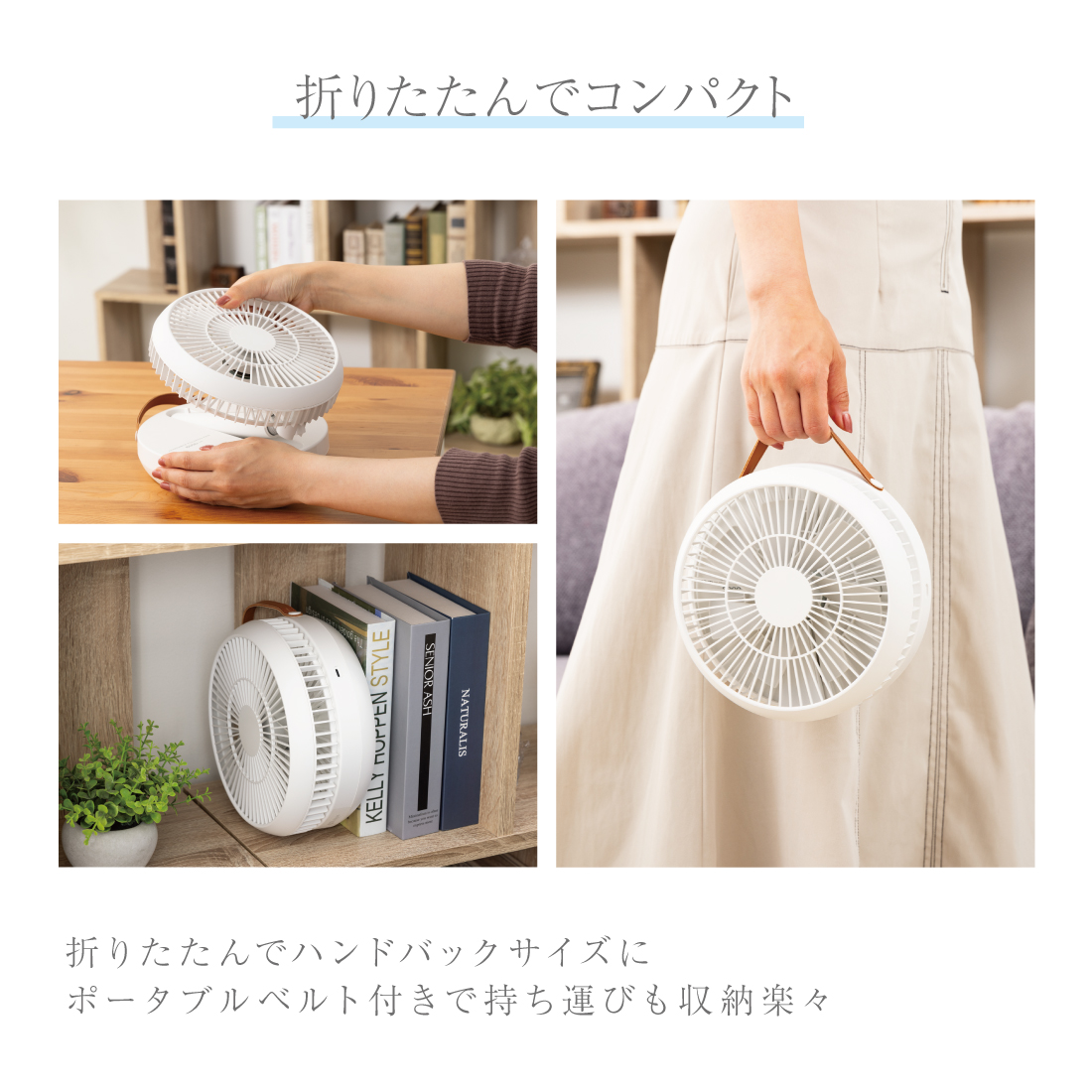 - 【210mmまで折りたためるコンパクト仕様】扇風機でかさばる支柱部分を折り畳み本体と一体化できるため、210mmまで畳めるので限られたスペースでも使用可能。冬などの扇風機を使用しないシーズンは畳んで収納できる伸縮性のコンパクトファンです。