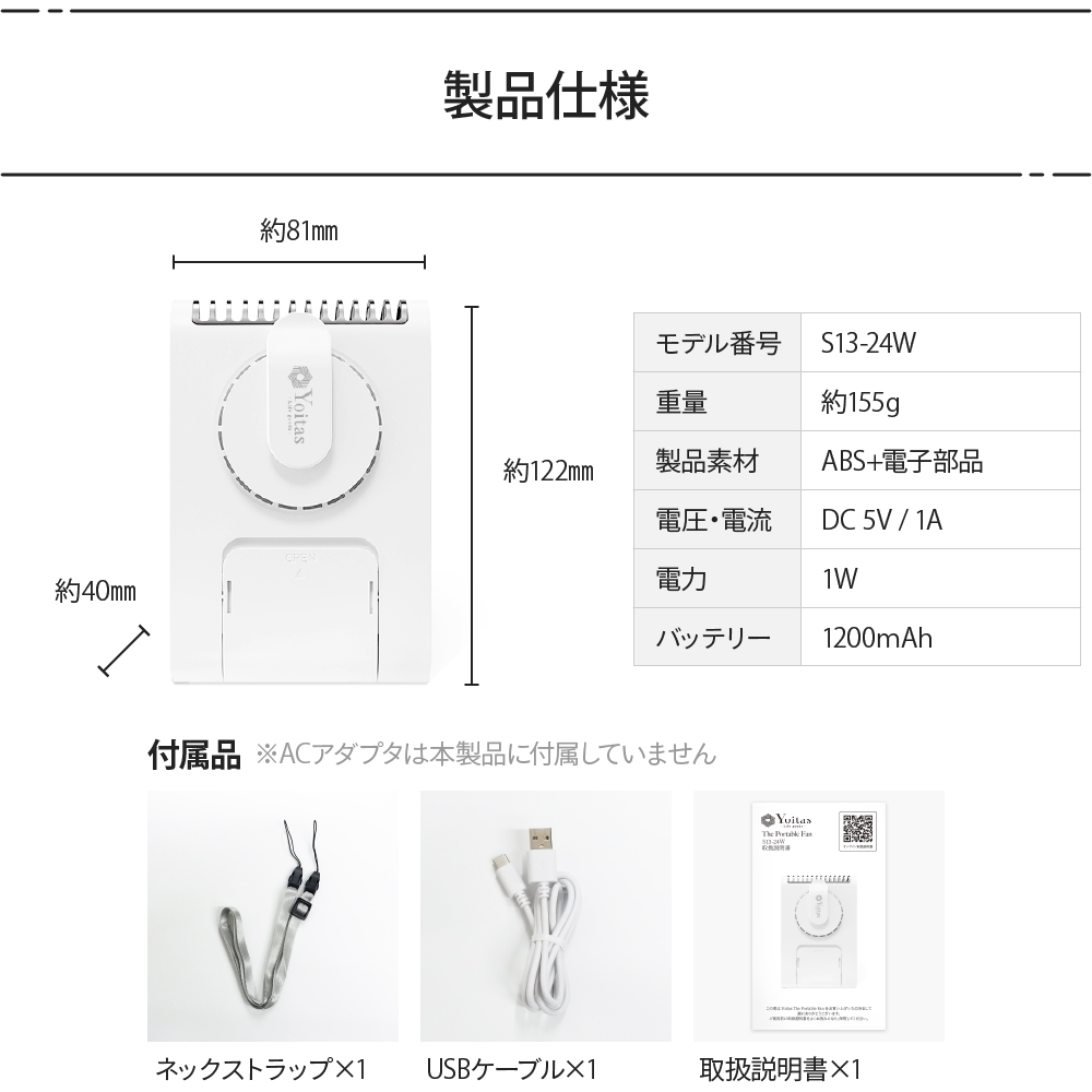 - 【最大約6時間連続稼働】USBからの充電式を採用している為、充電時間は3時間。長時間の連続稼働で、通勤は首かけ、オフィスでは卓上など、普段使いから、アウトドアの際のご使用でも、長時間お使いいただけます。